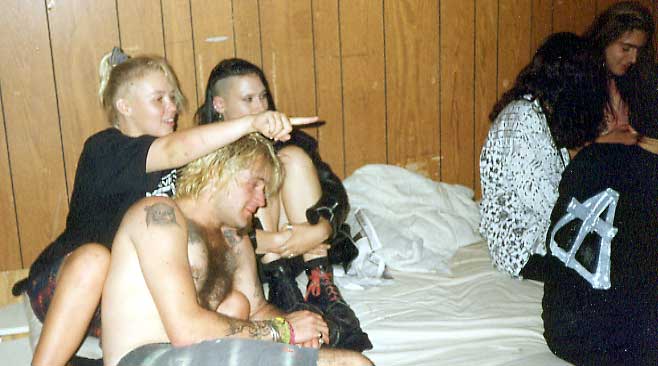 This was the scene the morning after at Jesus Bonehead's of the Dayglo Abortions. We played a show in town and then another in his basement with Coffin Break. He rolled out his living room rug to us for a couple nights.