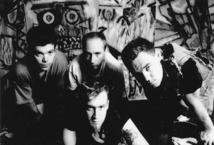 Top left to right - Tim (drums), John (guitar), Jim (bass), bottom - Drew (vocal). Drew joined the band in 1989. We originally asked Steve (BFG) 'cause he wasn't doing anything at the time. Steve declined but sent his buddy Drew. Drew handn't been in a band before but we gave him a try anyway - the rest is history. Tim had been with the band since about 1987 and played drums on half the songs from our "Re-issued" and "Welcome" CDs. He also played on our "This Whole World" 12 inch.